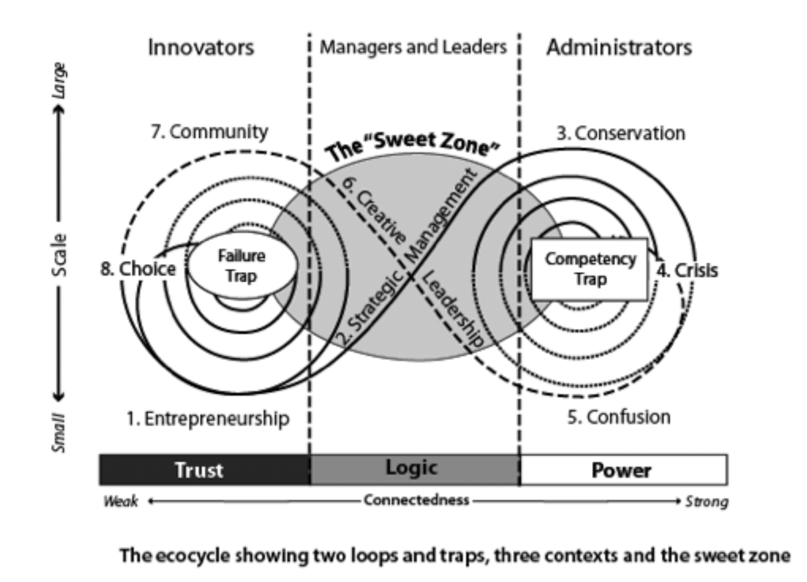 Another alternative is to get away from the stability trap and stick to what David K. Hurst calls the “Sweet Zone,” which is a zone of a dynamic balance where organizations invest in both innovations and in the exploitation of their existing assets.